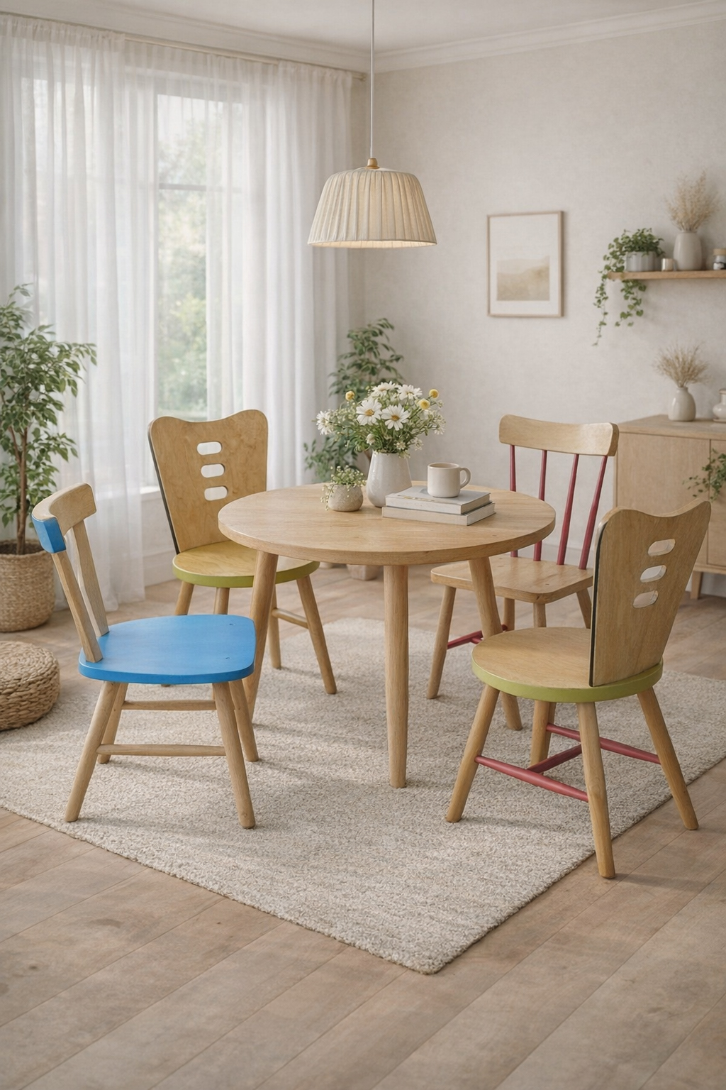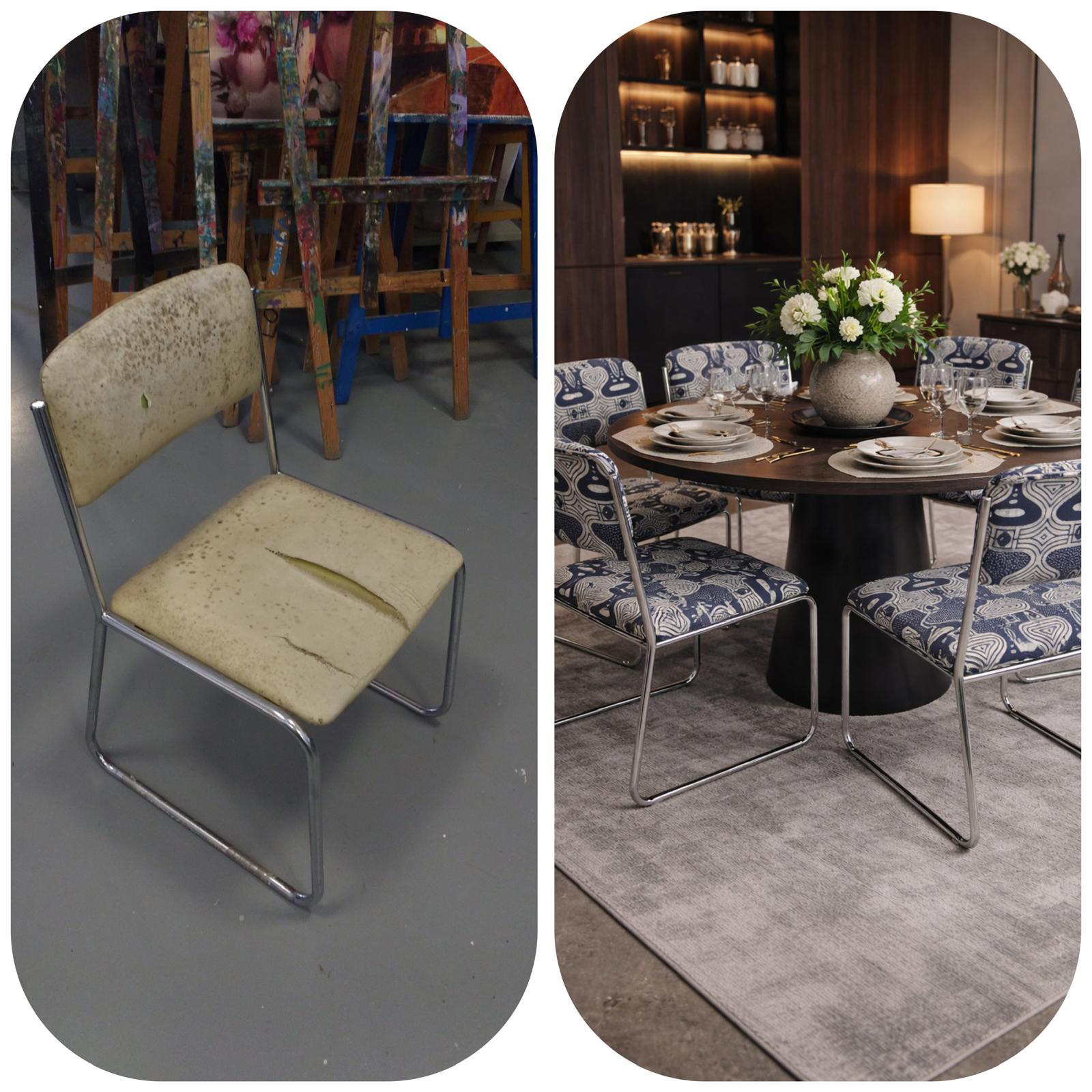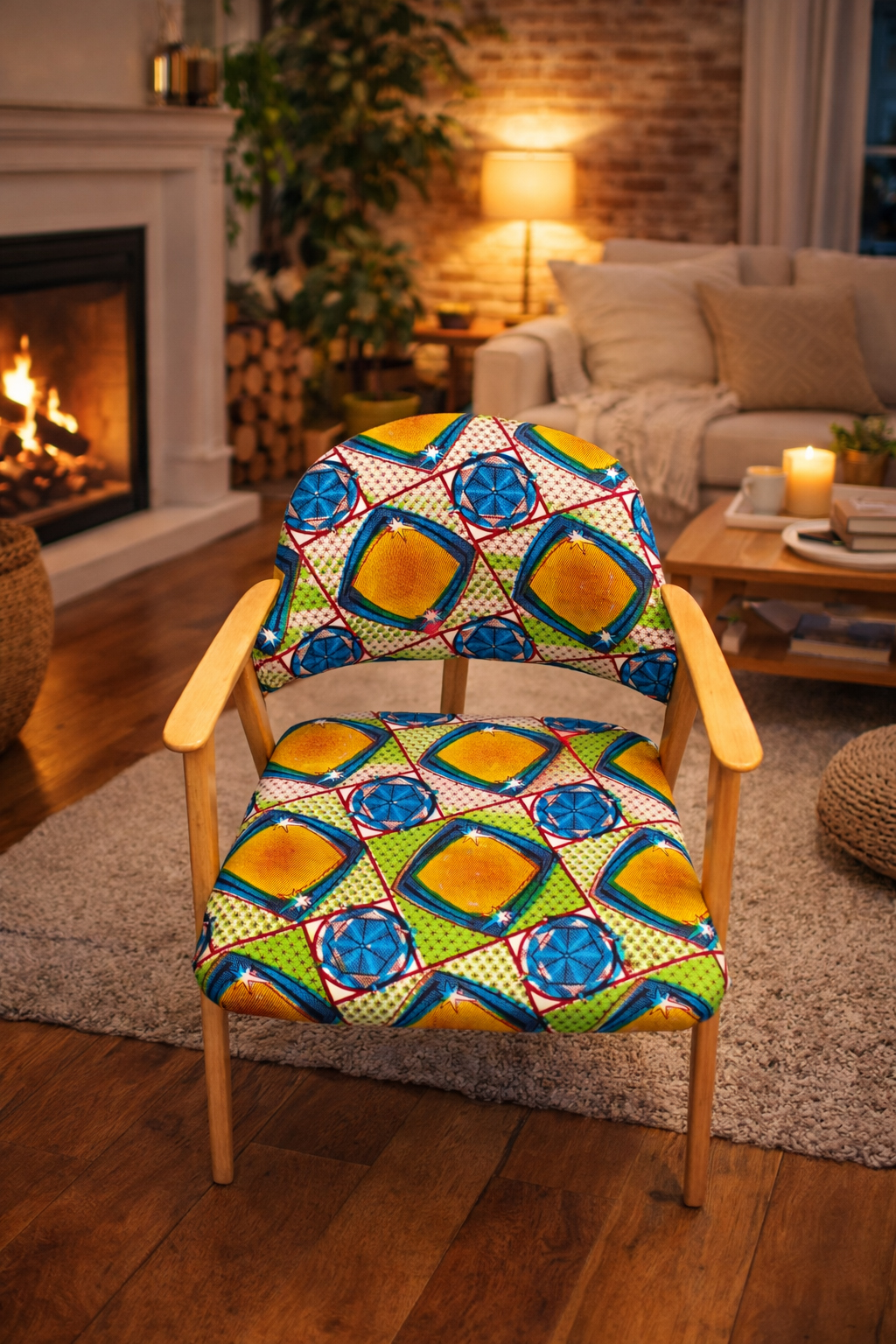 Sillas restauradas y tapizadas con tela africana, una fusión de restauración artesanal y diseño vibrante. Piezas únicas que combinan estructura recuperada con tejidos llenos de color y carácter, aportando personalidad y un aire contemporáneo a cualquier espacio.