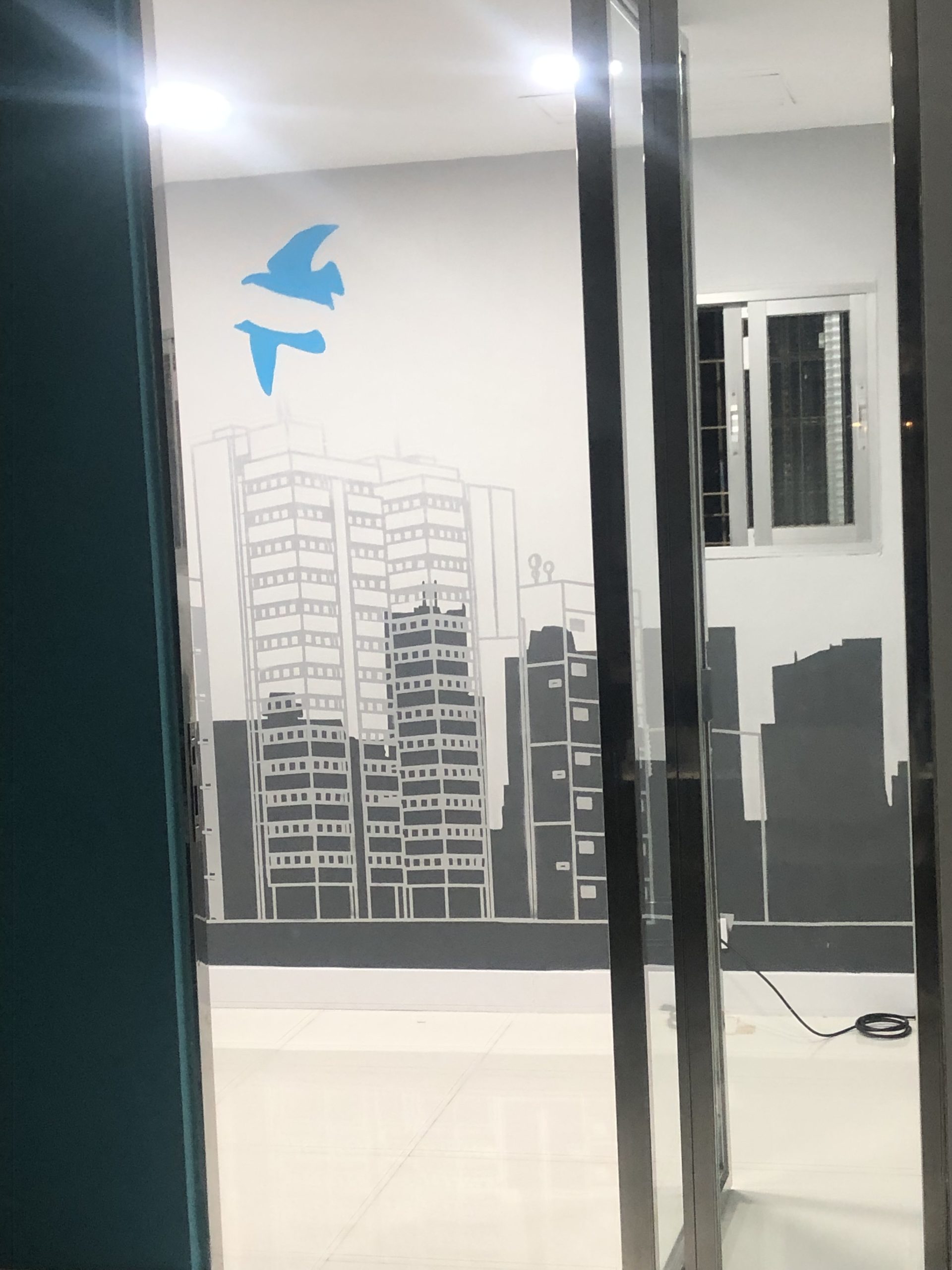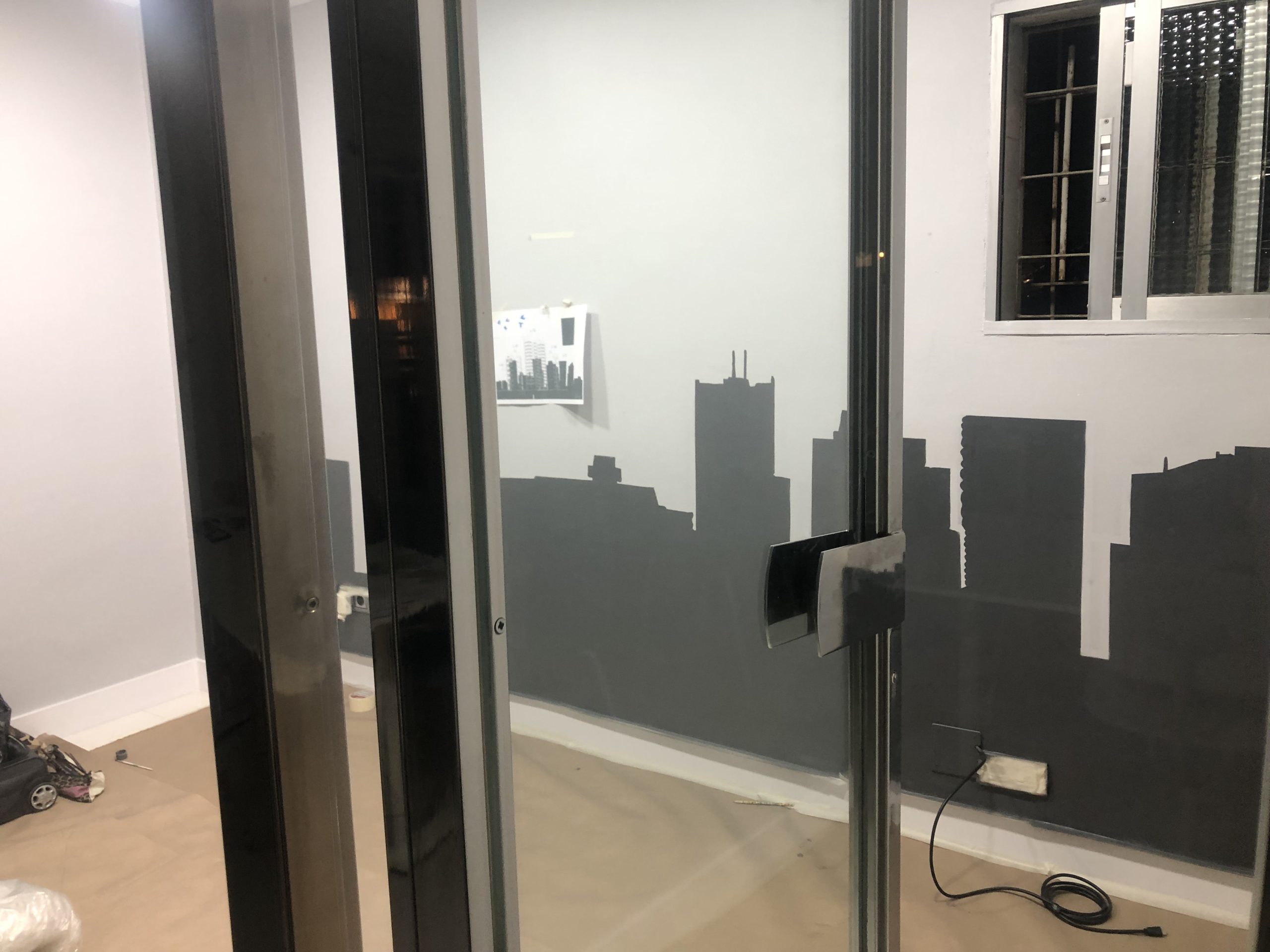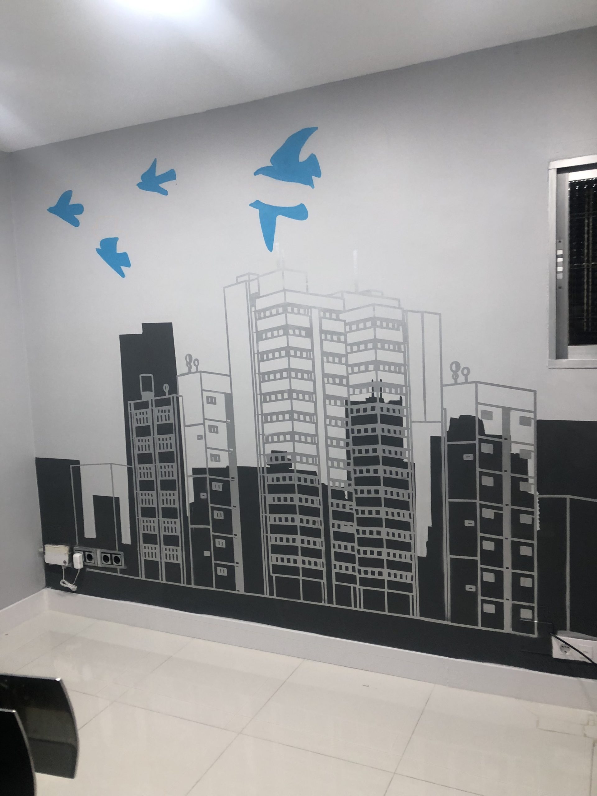El proyecto de decoración de la pared con un mural artístico fue desarrollado por nosotros, que nos inspiramos en los edificios de Moratalaz para crear un diseño único. La pared principal del local está cubierta por una serie de edificios de diferentes alturas, pintados en un contraste de gris oscuro y plateado. El logo de la inmobiliaria, también en plateado, se encuentra en la entrada principal.